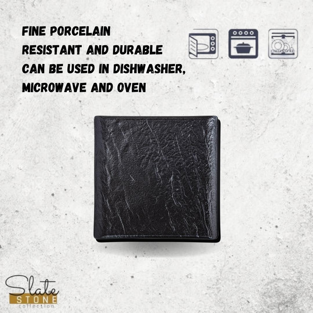 Die quadratische Form und die schwarze SlateStone Optik sorgen für eine moderne und elegante Präsentation. Der Teller harmoniert mit klassischen und modernen Tischdekorationen.