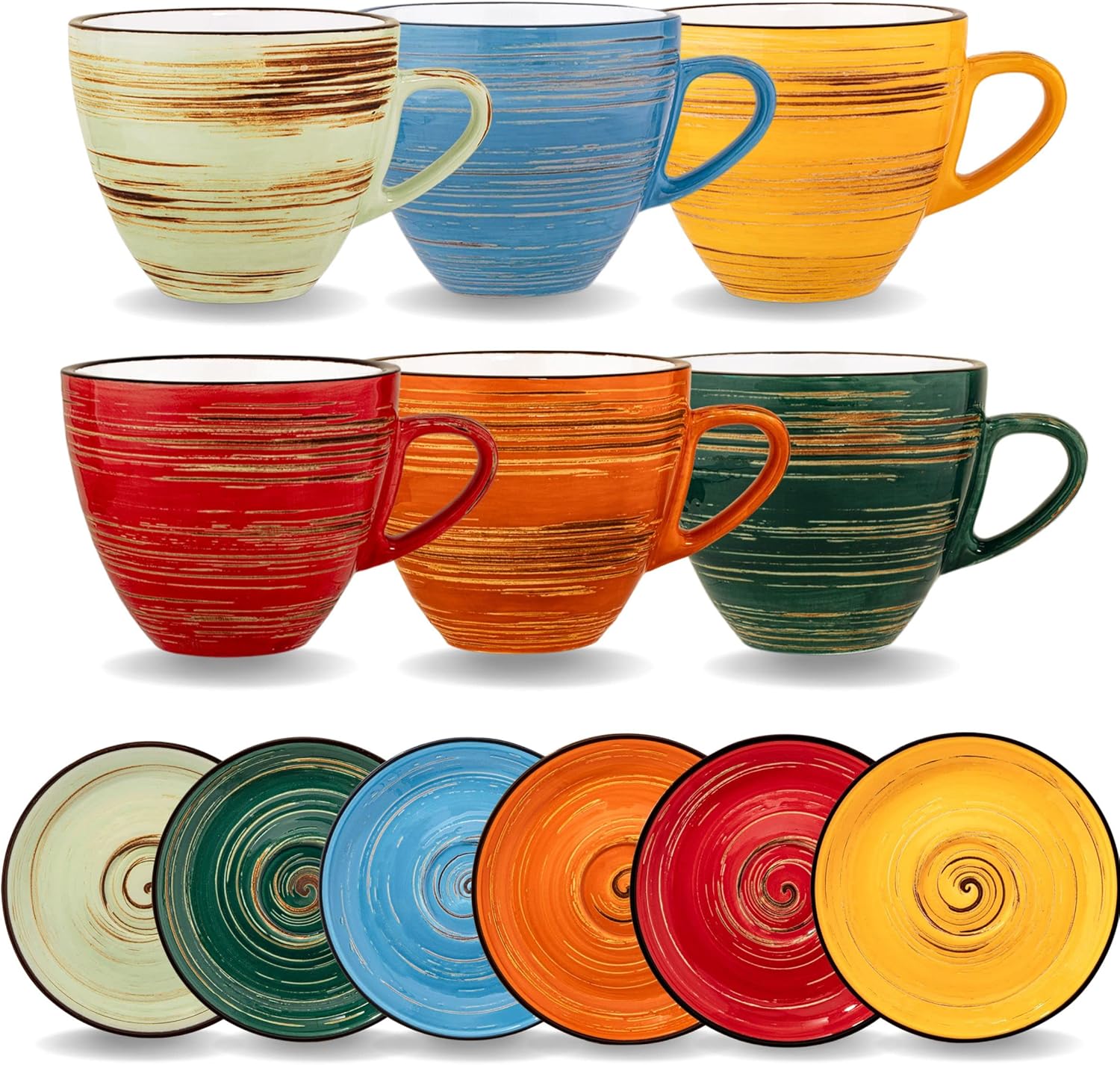 Im Set enthalten sind sechs Tassen mit passenden Untertassen – jeweils in den Farben Pistazie, Rot, Orange, Gelb, Grün und Blau. Die SPIRAL Kollektion steht für modernes Design mit lebendigen Farben und ist ideal für den täglichen Gebrauch geeignet.